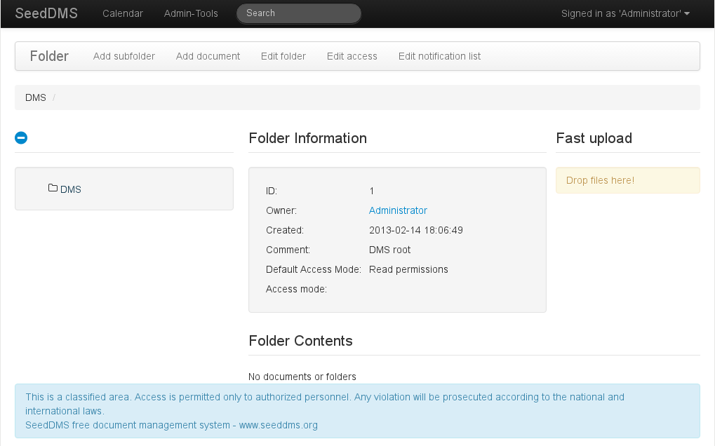 A convinient way to upload one or more files into the dms is the so called ‘Fast upload’ option, which must be turned on in the configuration. It will add a new section, next to the folder information on the folder view page. Dragging one or more files from your local computer and dropping it onto the yellow area will upload each file as a new document into the current folder. As there is no way to set any of the document nor version attributes, the document name will be taken from the file name and the document will be released right away. Since SeedDMS 6.0.0 the initial document status can be set to draft, which preserves the possibility to to set approver, reviewer, or a workflow afterwards.