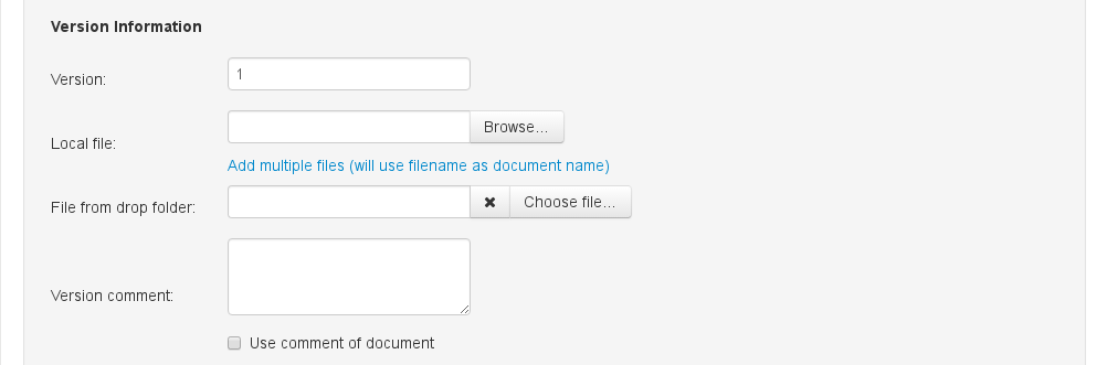 The form for uploading a document is split into several sections. For now, only the upper two sections Document information and Version information are of interest. The document information will be displayed in all lists and depicts all versions of the document. The version information is only related to the particular file, that is going to be uploaded. Documents have a name, comment and position just like folders. Additionally a document can have keywords, an expiration date and can be assigned to predefined categories. The version has its own comment and a version number which is preset to 1. The only required field to be set is the local file. Not even the document name is required. It is taken from the uploaded file if not set explicitly.