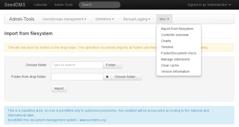 For more than one file or possibly a complete file system structure containing not just documents but also folders, there is second way to import files, which also uses the drop folder. As this can be used to import massive amounts of data, its use is restricted to administrators only. It can be found in the Misc menu item on the Admin-Tool page.