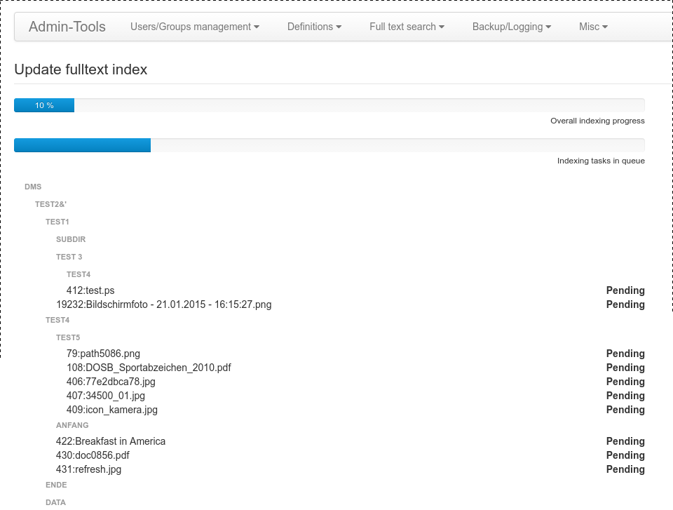 A document with status ‘document unchanged’ will not be indexed again, because it has not been updated since the last indexing. If a document needs to be updated in the index, it will first be in state ‘Pending’, when it is being indexed it has the state ‘Processing …’ and once that is ready, it will change to ‘Done’. The progress bars show the overall progress and the currently in parallel processed documents which may be 5 at most. The parallelization is done by the browser which retains a queue and spawns a new indexing progress if there is a free slot in the queue. If fulltext indexing is turned on, there will also be another item in the folder menu for indexing just that particular folder including all subfolders. This comes handy if a new document was just uploaded and shall be visible in the fulltext index without doing a full index update.