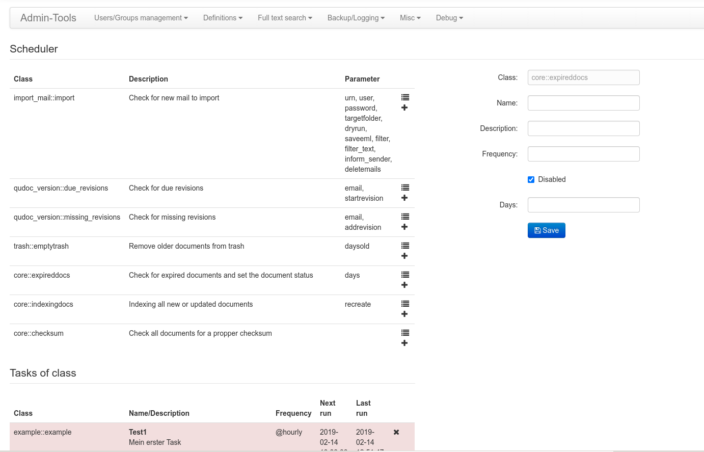 The page of the scheduler is divided in three areas. The upper left area list all available task classes. Those with a class name starting with core are shipped with SeedDMS. Other may be added by extensions. A task class is like a blueprint for a task. The list of classes also includes a description and a list of parameters for controlling the behaviour of an instanciated task. The last column of that table has two icons. One for creating a task from this class and one for listing all task already created. The list of created tasks will show up below the list of classes. I new task will be added with the form on the right hand side of the list of classes once the plus button was clicked. It is perfectly fine to have more than one task based on the same task class, e.g. to run an incremental fulltext indexing every hour and a recreation of the fulltext index once a day at night. Each task has a common set of paramters