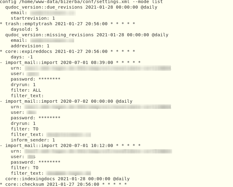 Each task in the list starts either with a blank if its enabled but not scheduled for running, a - for tasks currently disabled, or a * for tasks scheduled for running. The first line of each task also list the name of the task class, the date/time of the next scheduled run, and the frequency of this task. All indented lines are parameters, which are specific for this particular task.